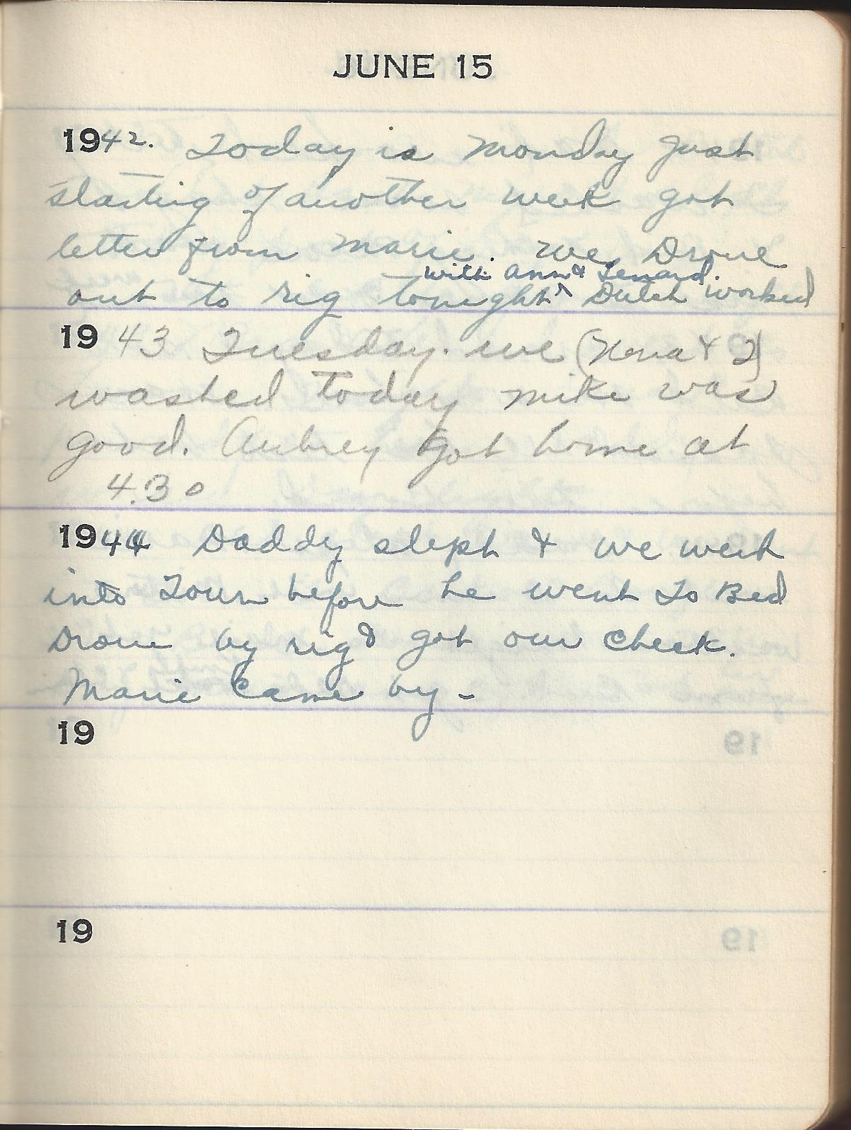 1944 Daddy slept & we went into Town before he went To Bed Drove by rig & got our check. Marie came by –