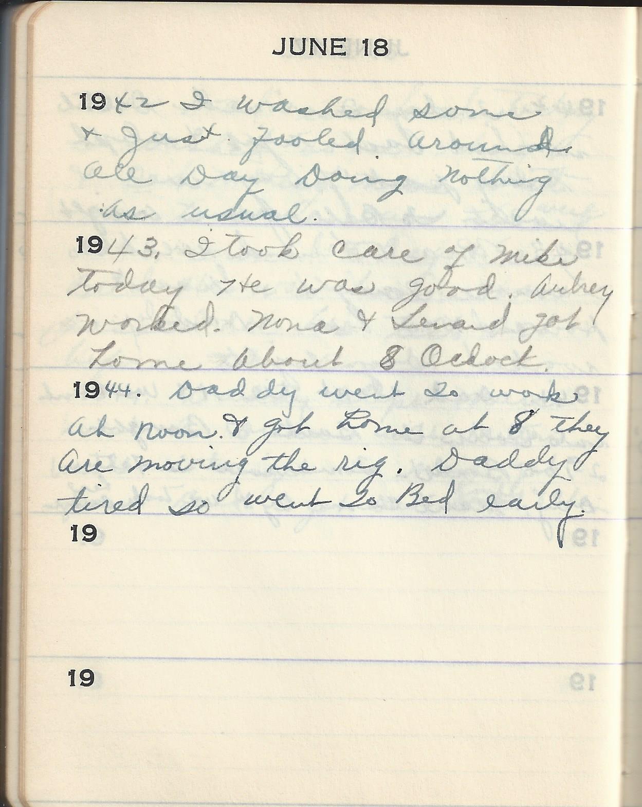 1944 Daddy went to work at Noon & got home at 8 they are moving the rig. Daddy tired so went To Bed early.