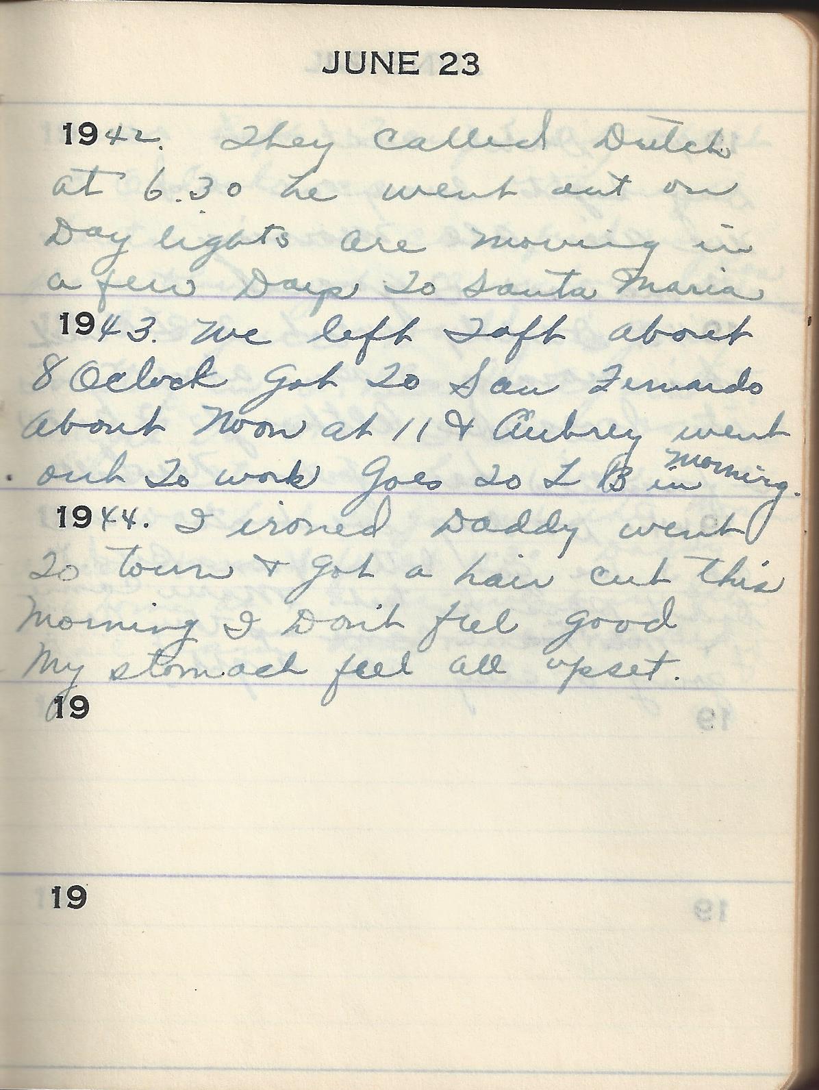 1943 We left Taft about 8 Oclock Got To San Fernando about noon at 11 & Aubrey went out To work Goes To LB in morning.