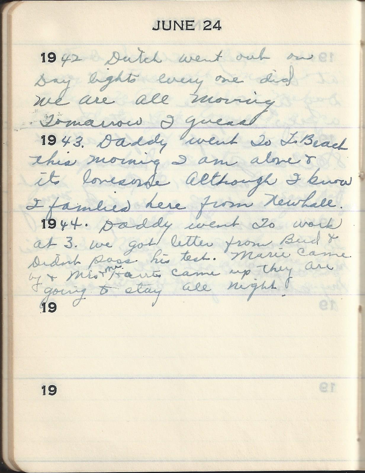 1943 Daddy went to L Beach this morning I am alone & its lonesome Although I know 2 families here from Newhall.