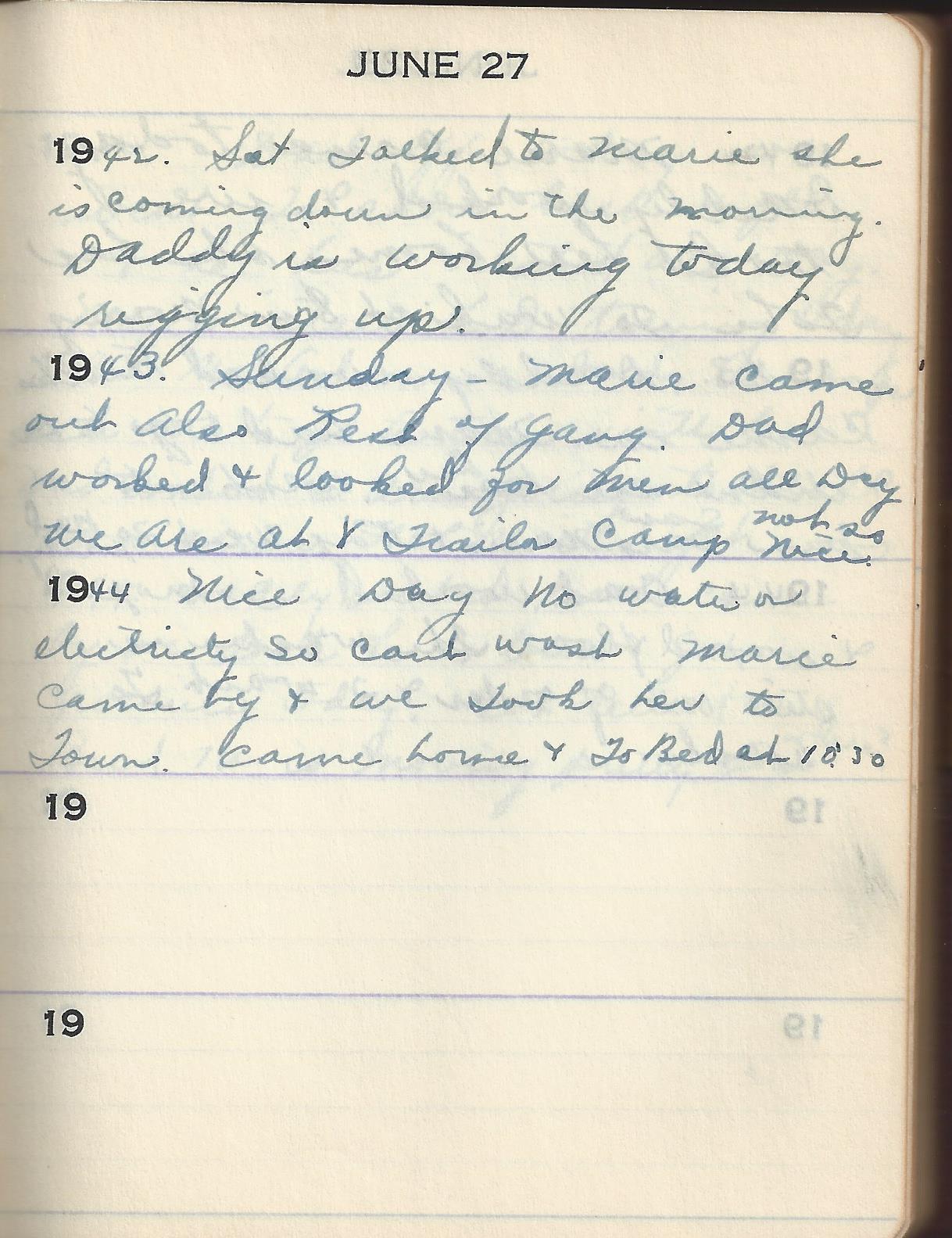 1942 Sat Talked to Marie she is coming sown in the morning. Daddy is working today rigging up.