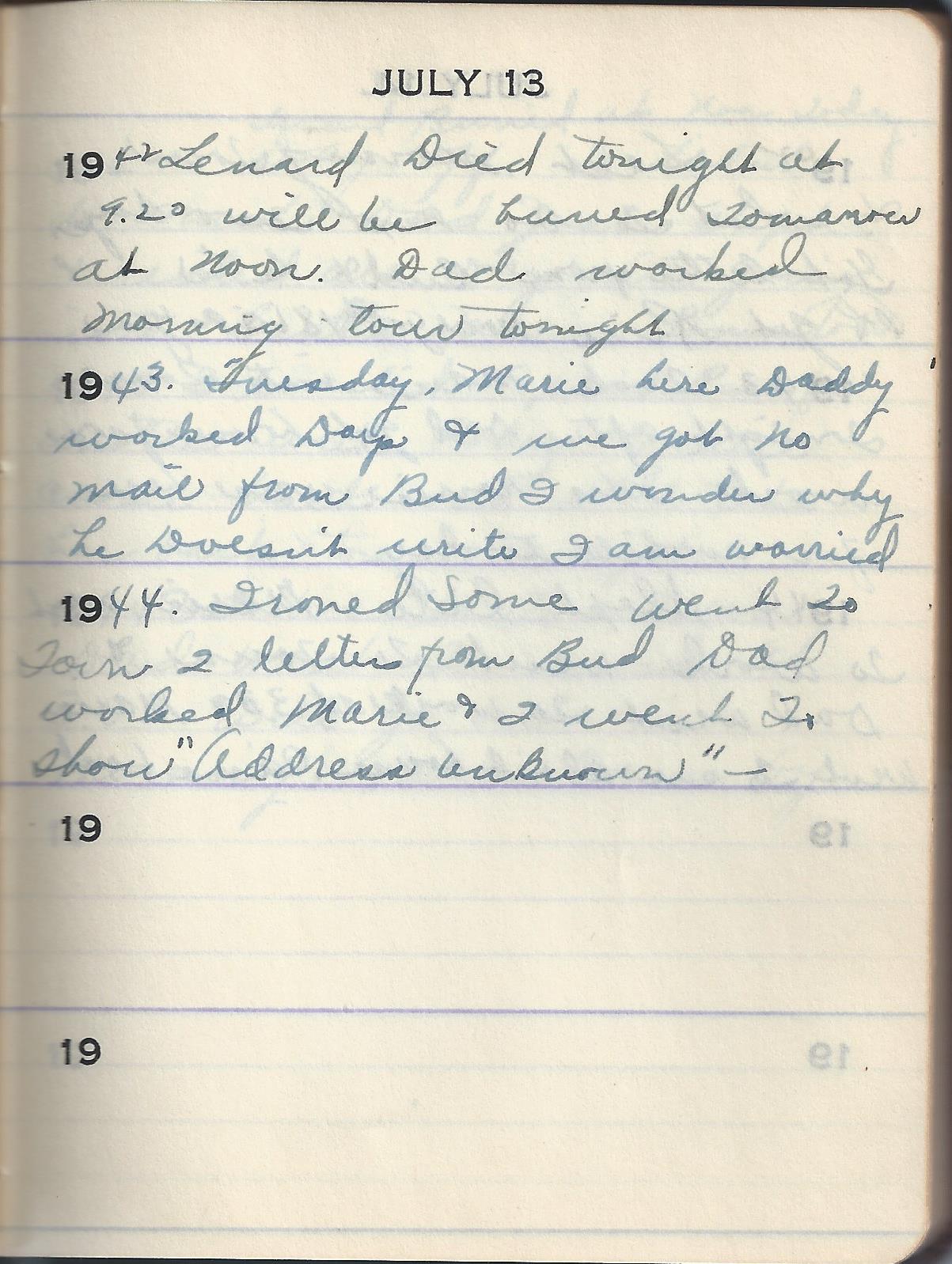 1942 Lenard died tonight at 9.20 will be buried Tomorrow at Noon. Dad worked Morning tour tonight