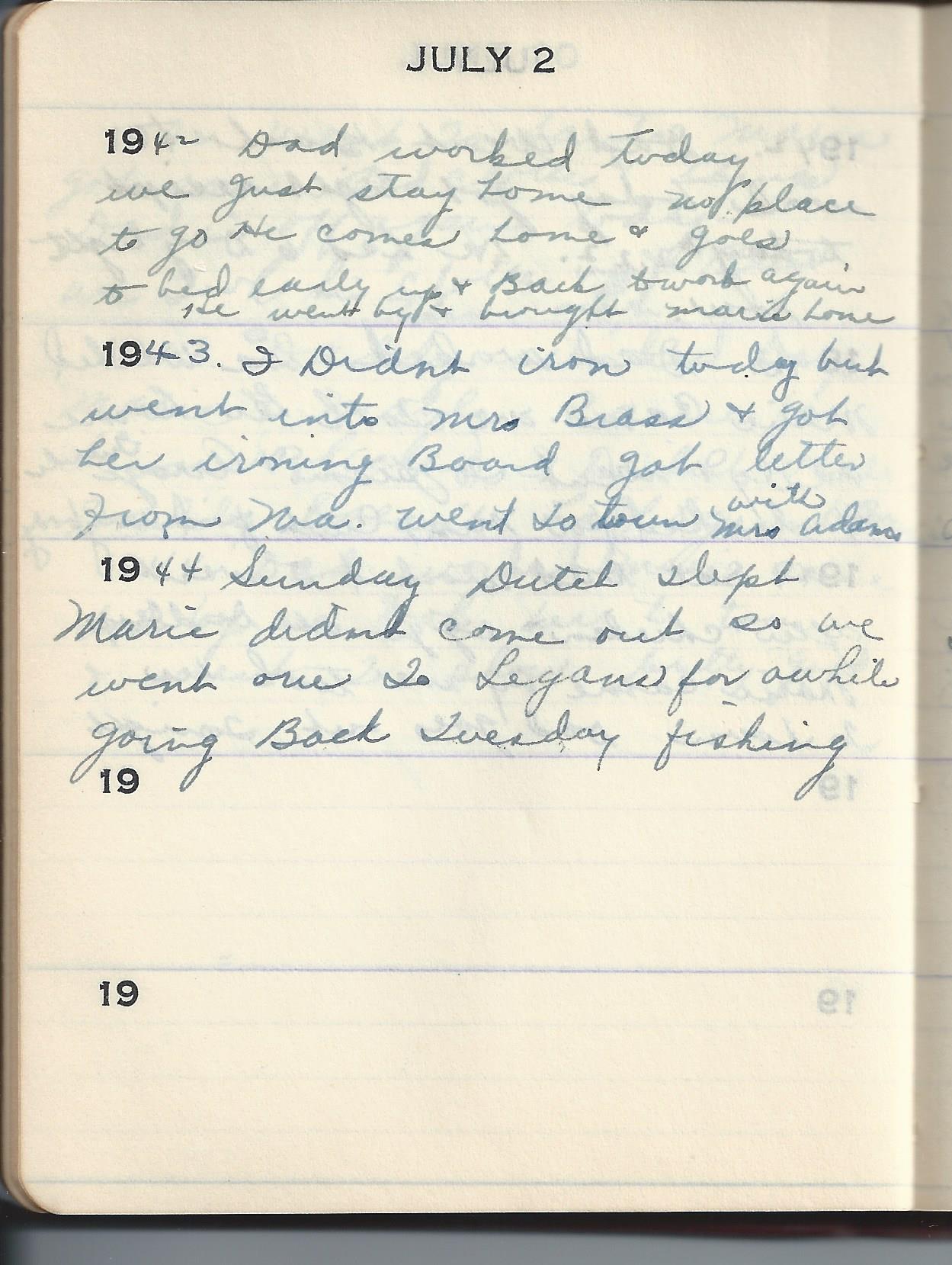 1942 Dad worked today we Just stay home No place to go He comes home & goes to bed early up & Back to work again He went by & brought Marie home