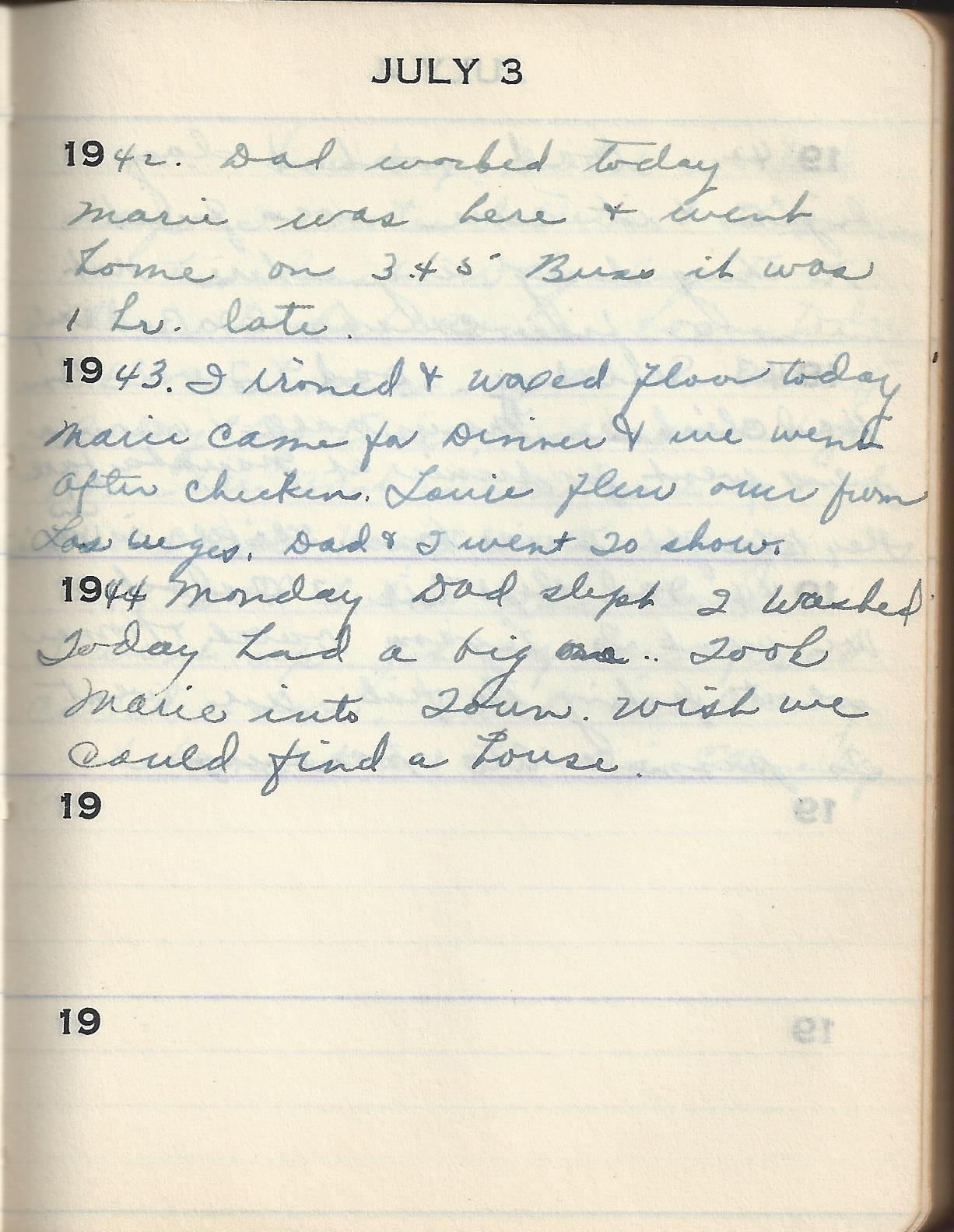 1943 I ironed & waxed floor today Marie came for Dinner & we went after chicken. Louie flew over from Las Vegas. Dad & I went To show.