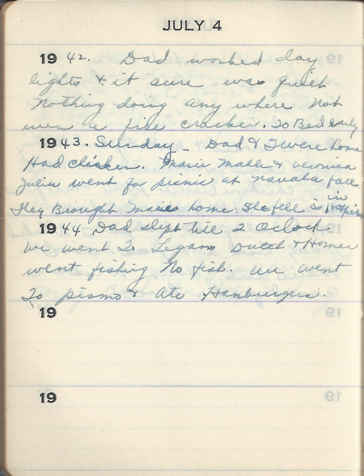 1942 Dad worked day lights & it sure was quiet Nothing doing any where Not even a fire cracker. To Bed early