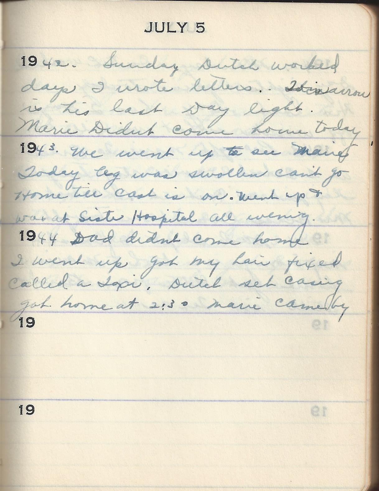 1943 We went up to see Marie Today leg was swollen can’t go Home till cast is on. Went up & was at Sister Hospital all evening.