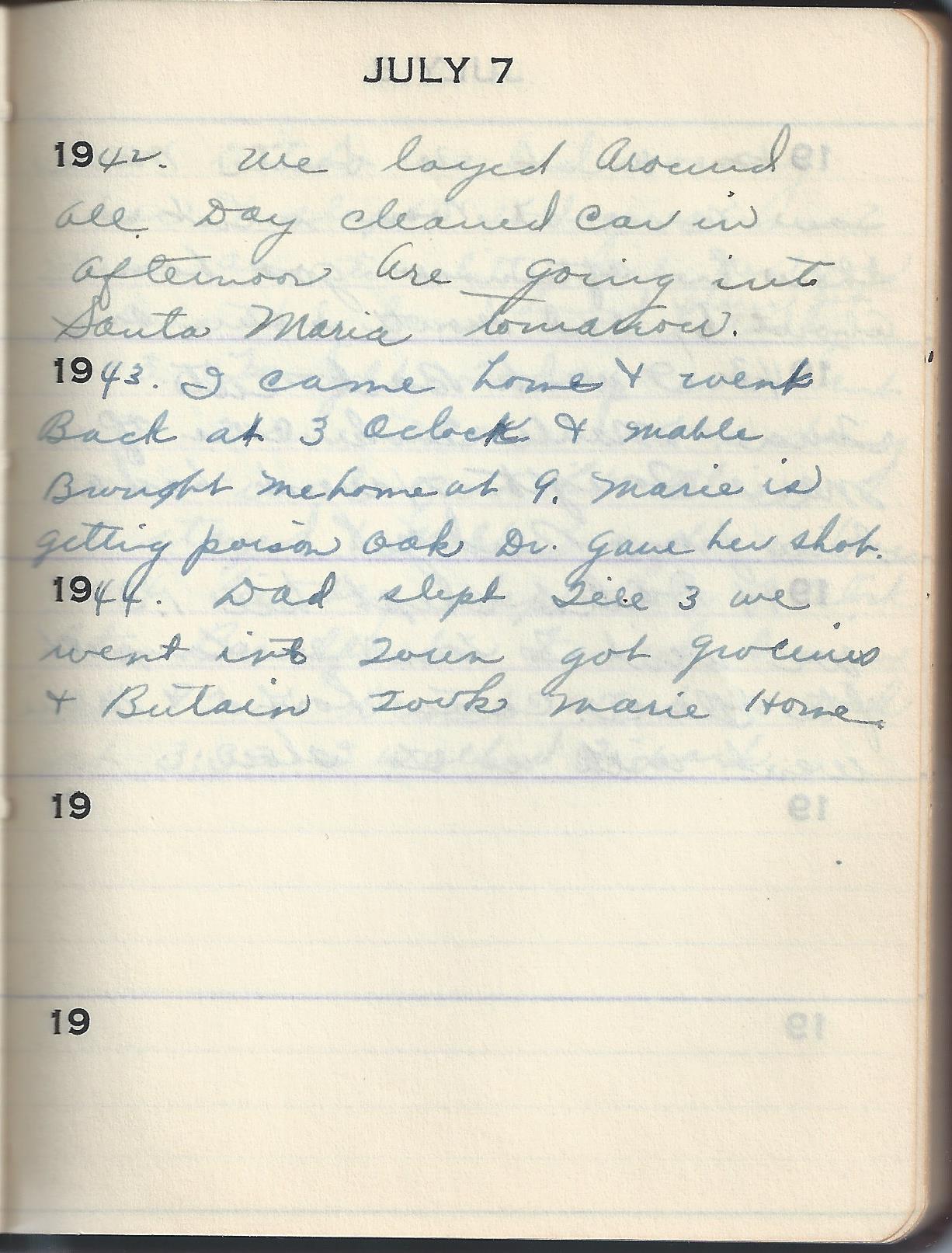 1943 I came home & went Back at 3 Oclock & Mable Brought Me home at 9. Marie is getting poison oak Dr. gave her shot.