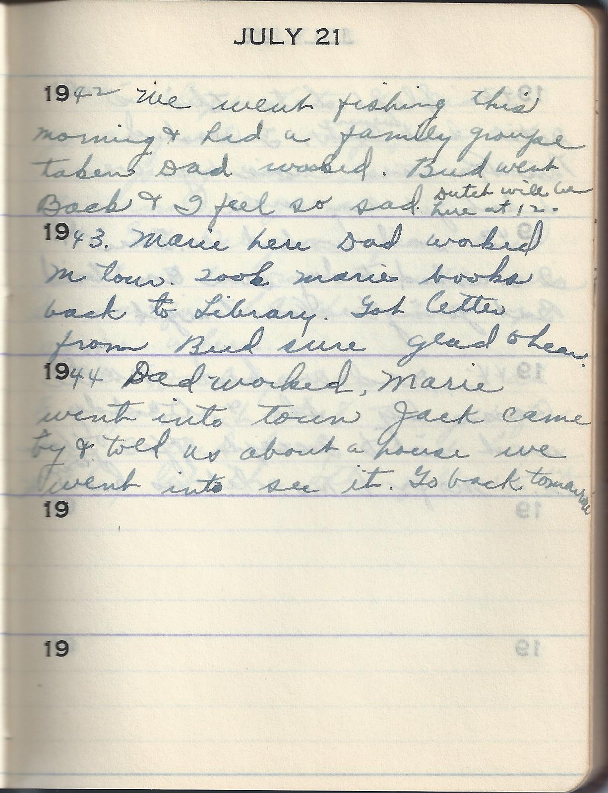 1944 Dad worked. Marie went into town Jack came by & told us about a house we went into see it. Go back tomorrow