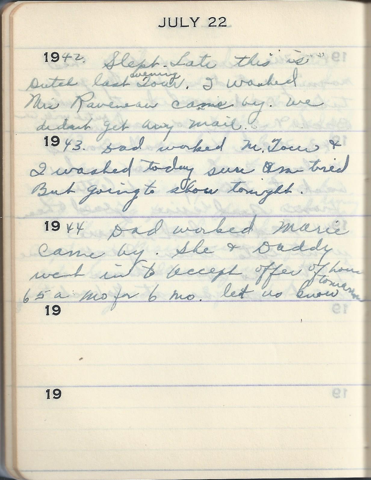 1944 Dad worked Marie came by. She & Daddy went in to accept offer of house 65 a mo for 6 mo. let us know tomorrow