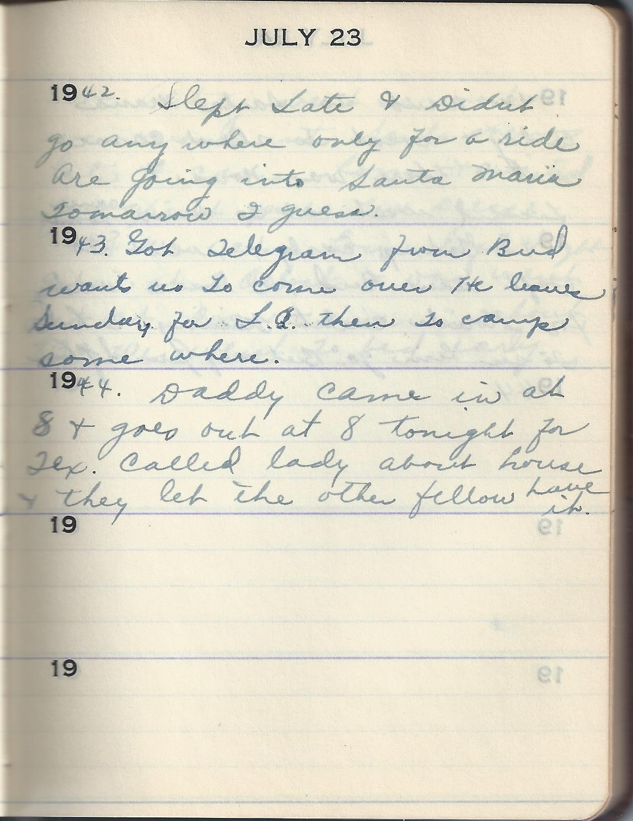 1943 Got Telegram from Bud wants us To come over He leaves Sunday for L.A. then to camp some where.