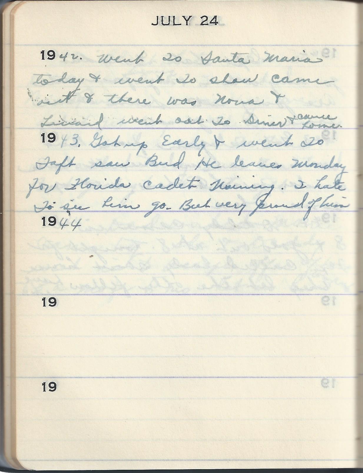 1943 Got up Early & went To Taft saw Bud He leaves Monday for Florida Cadet Training. I hate To see him go. But very proud of him