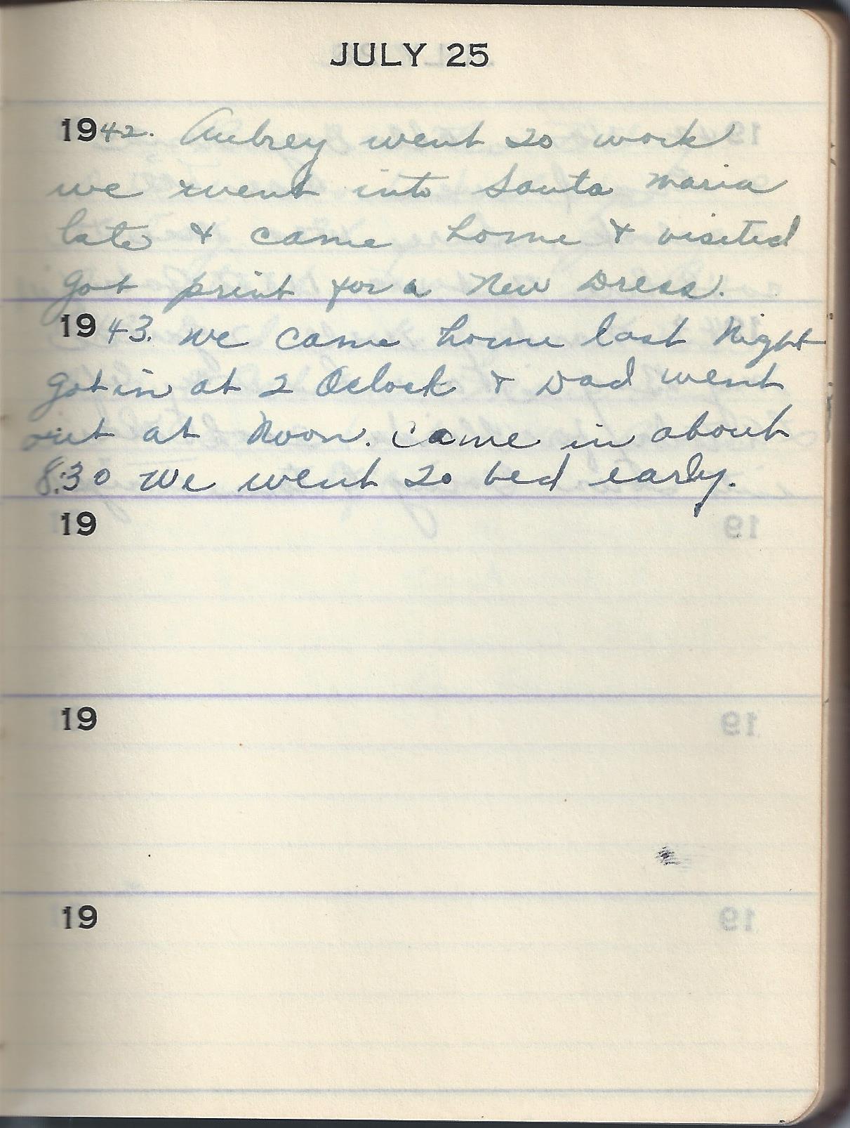 1942 Aubrey went To work We went into Santa Maria late & came home & visited got print for a New Dress.