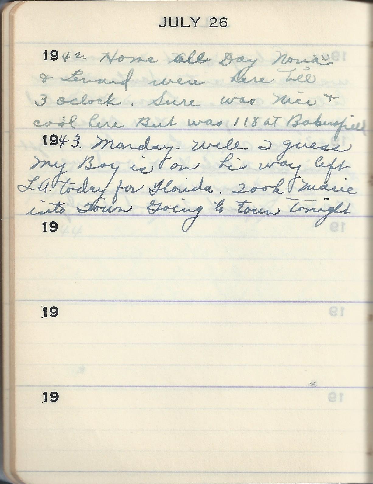 1943 Monday. Well I guess My Boy is on his way left L.A. today for Florida. Took Marie into Town Going to town tonight