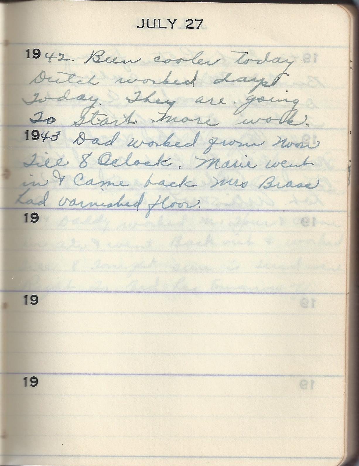 1943 Dad worked from Noon Till 8 Oclock. Marie went in & came back Mrs Brass had varnished floor.