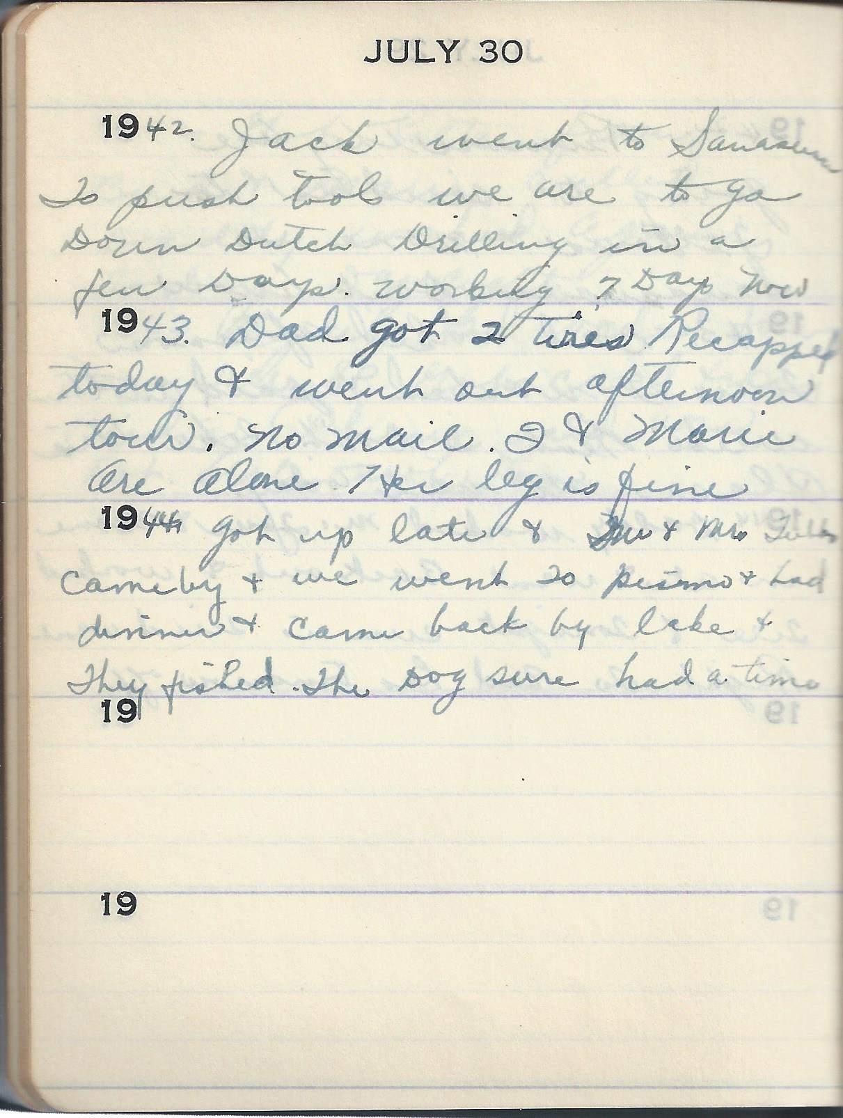 1942 Jack went to Sanaslana [?] To push tools we are to go Down Dutch Drilling in a few Days. Working 7 Days Now.