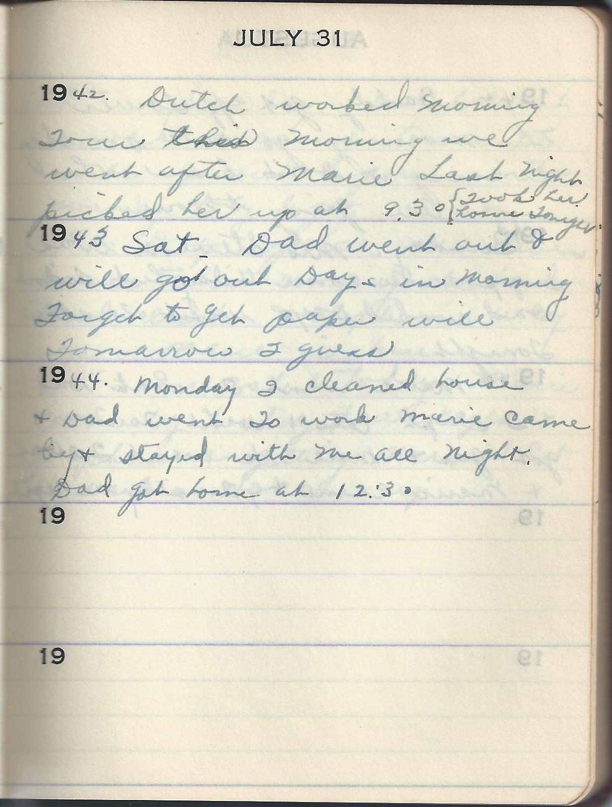 1944 Monday I cleaned house & Dad went To work Marie came by & stayed with Me all Night. Dad got home at 12:30