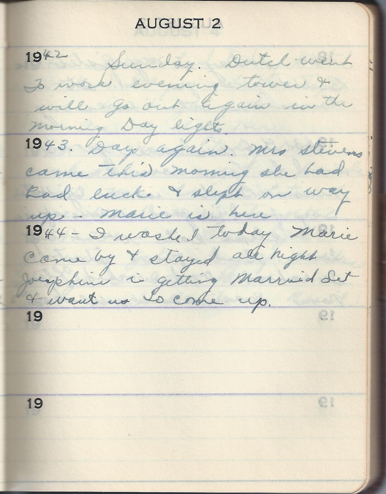 1944 I washed today Marie came by & stayed all Night Josephine is getting Married Sat & want us to come up.