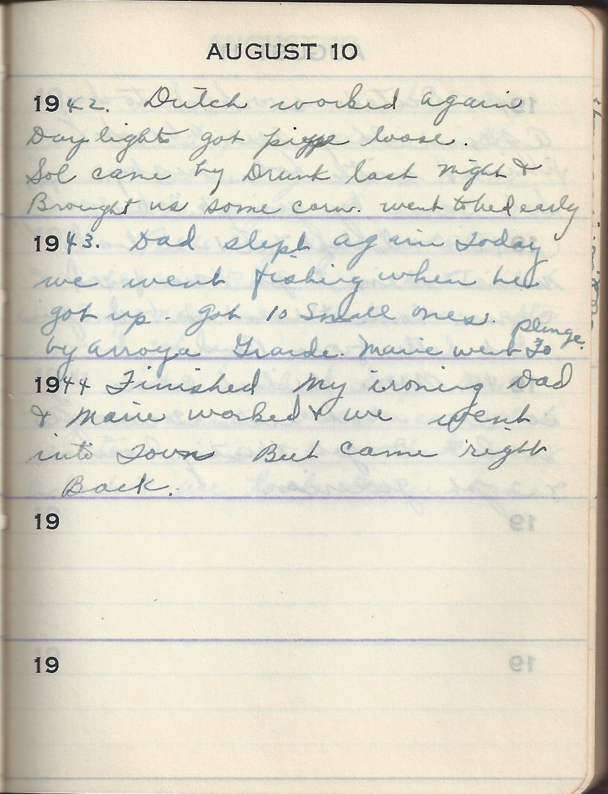 1943 Dad slept again today we went fishing when he got up. got 10 Small ones. by Arroya Grande. Marie went To plunge.