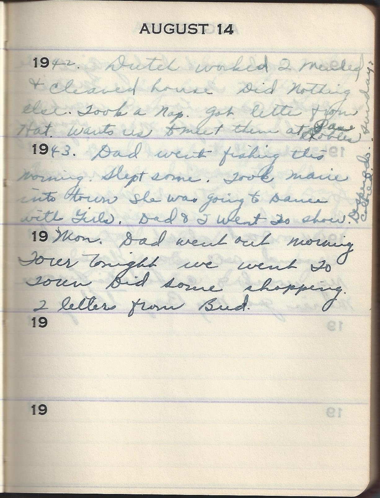 1943 Dad went fishing this morning. Slept some. Took Marie into town She was going to Dance with Girls. Dad & I went To show. Desperado. Colored (?).