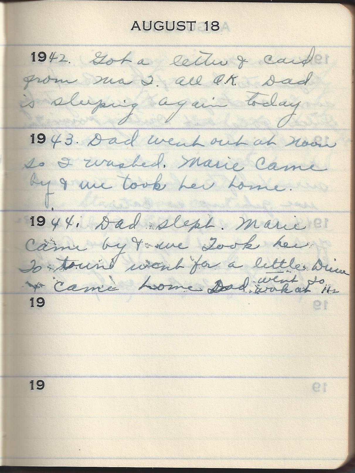 1944 Dad slept. Marie came by & we Took her To town went for a little Dinner & came home. Dad went To work at 11