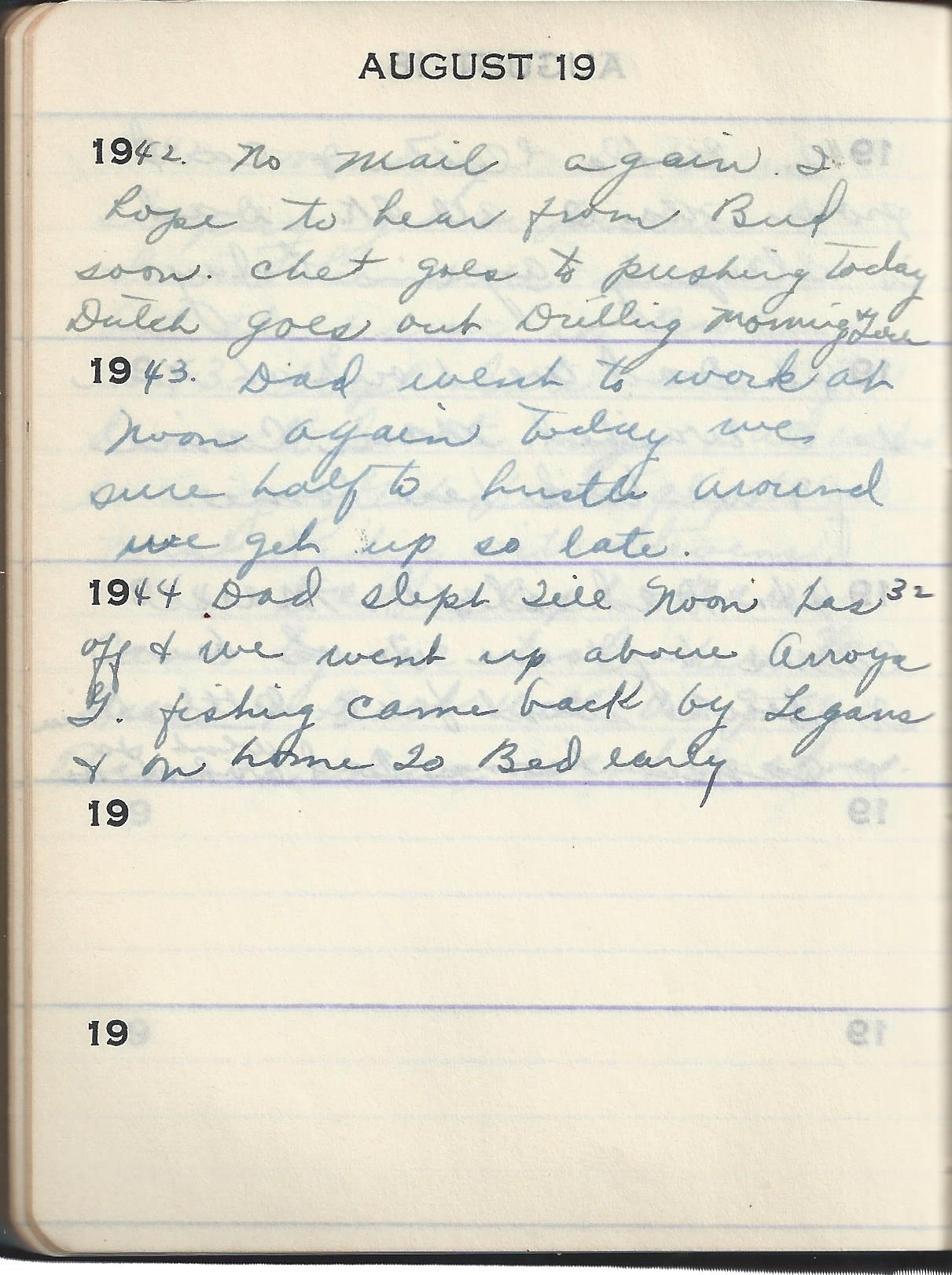 1944 Dad slept Till Noon has 32 off & we went up above Arroya G. fishing came back by Legans & on home To Bed early