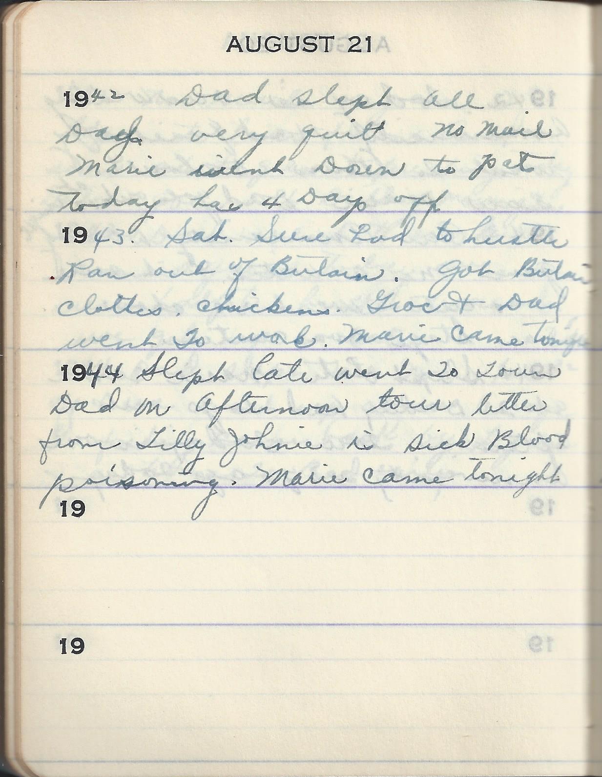 1944 Slept late went To Town Dad on afternoon tour letter from Lilly Johnie is sick Blood poisoning. Marie came tonight