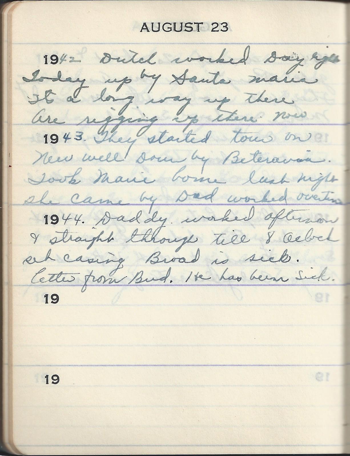 1943 They started tour on New well Down by Beteravia. Took Marie home last Night she came by Dad worked overtime