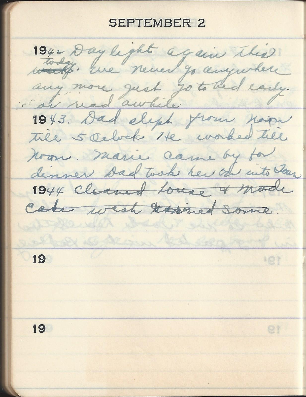 1942 Day light again this week. today. we Never go anywhere any more Just to bed early. or read awhile.