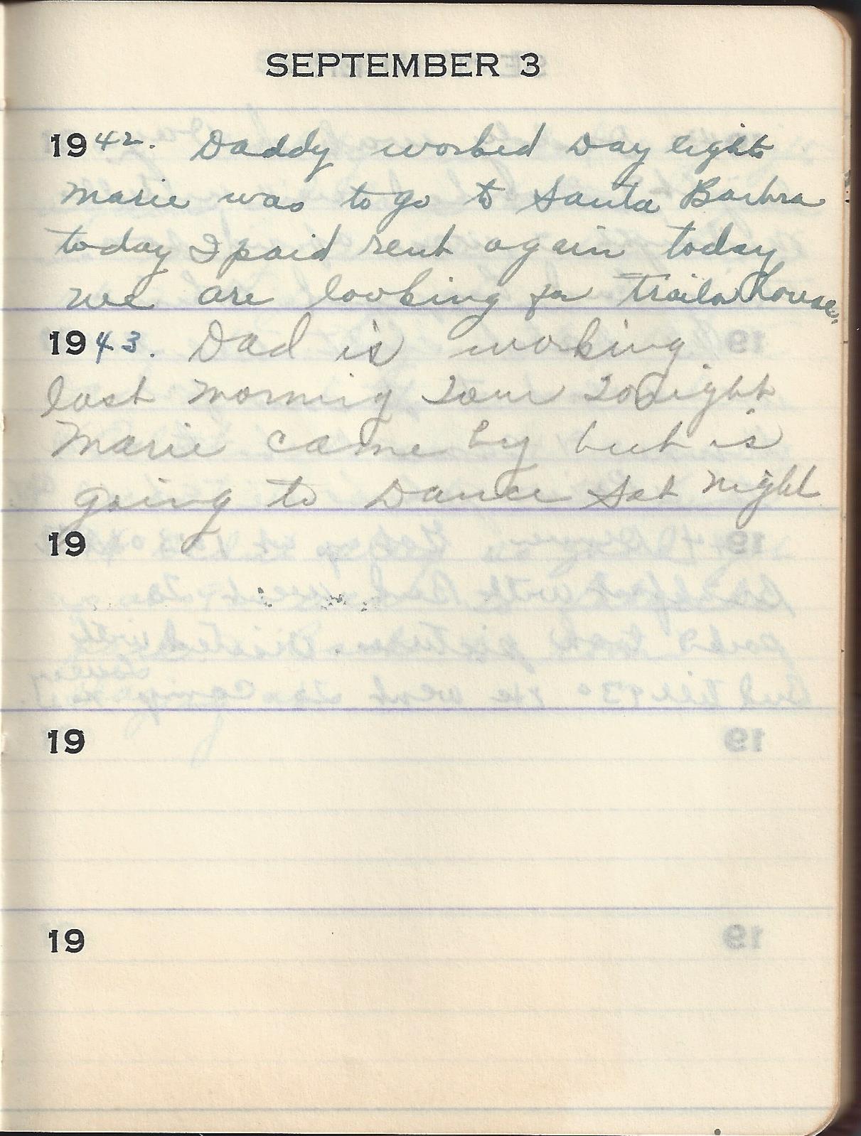 1942 Daddy worked Day light Marie was to go to Santa Barbra today I paid rent again today we are looking for trailor house