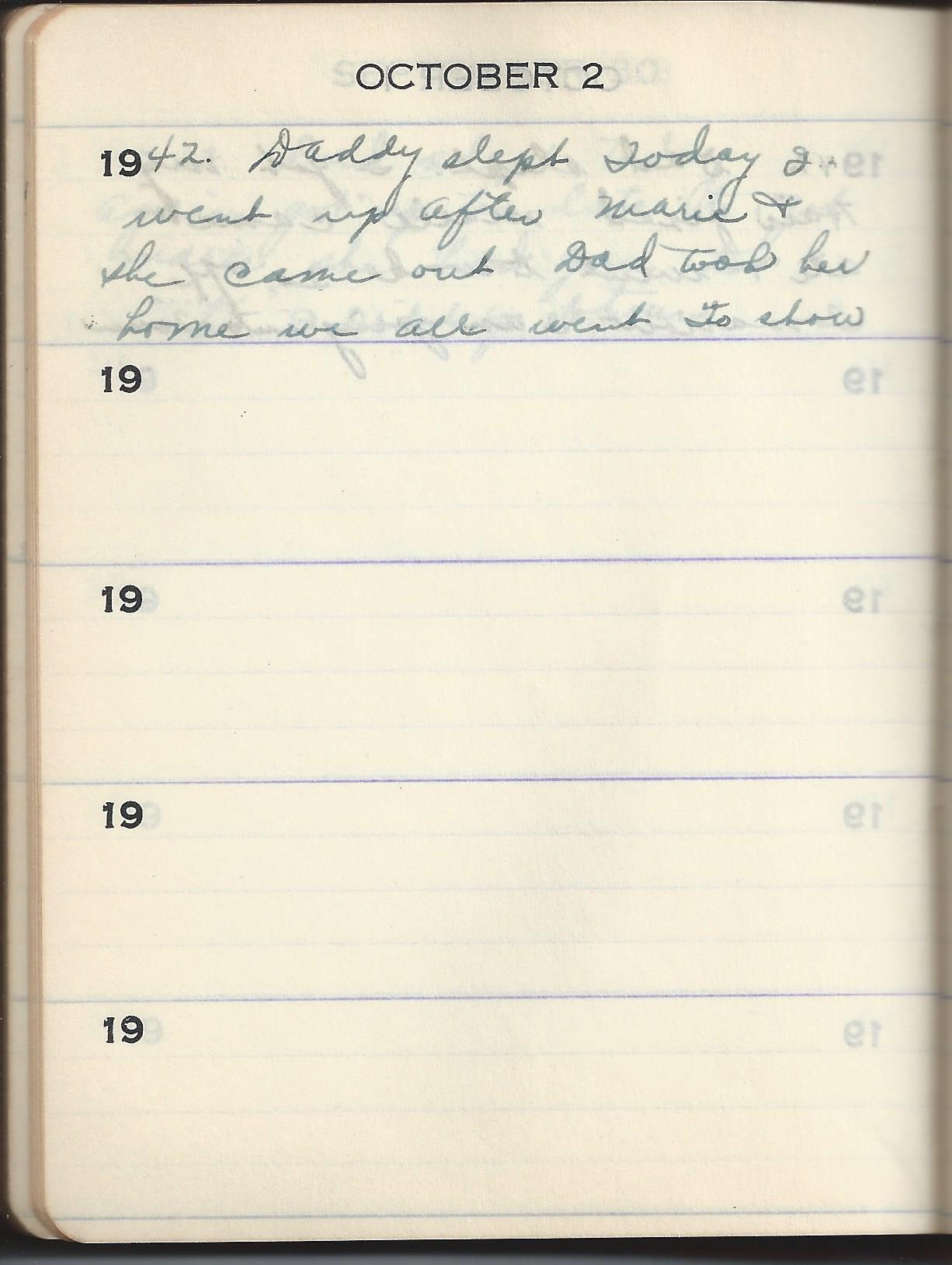 1942 Daddy slept Today I went up after Marie & she came out Dad took her home we all went to show