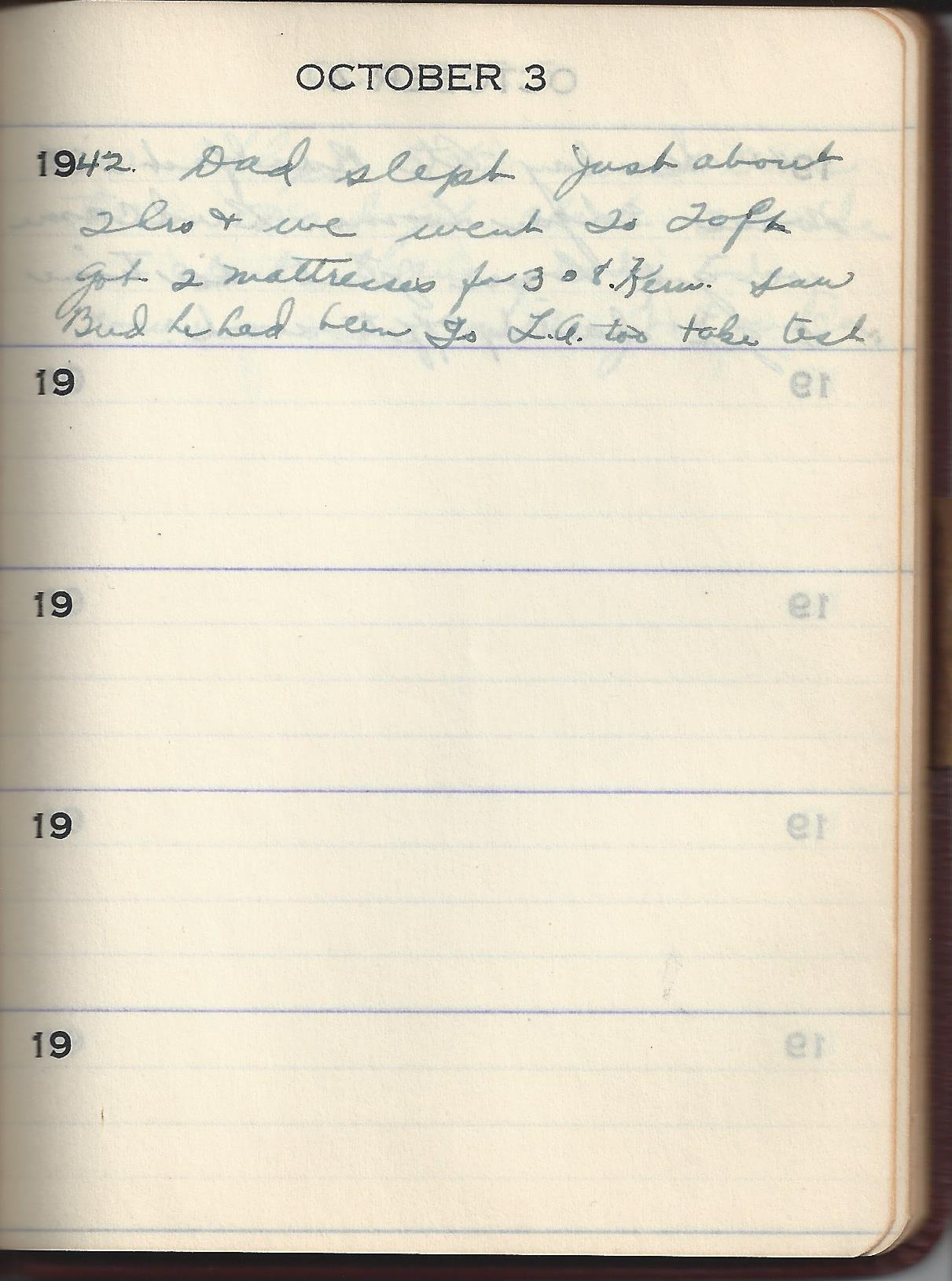 1942 Dad slept Just about 2 hrs & we went to Taft got 2 mattresses for 308 Kern. Seen Bud he had been To LA. too take test