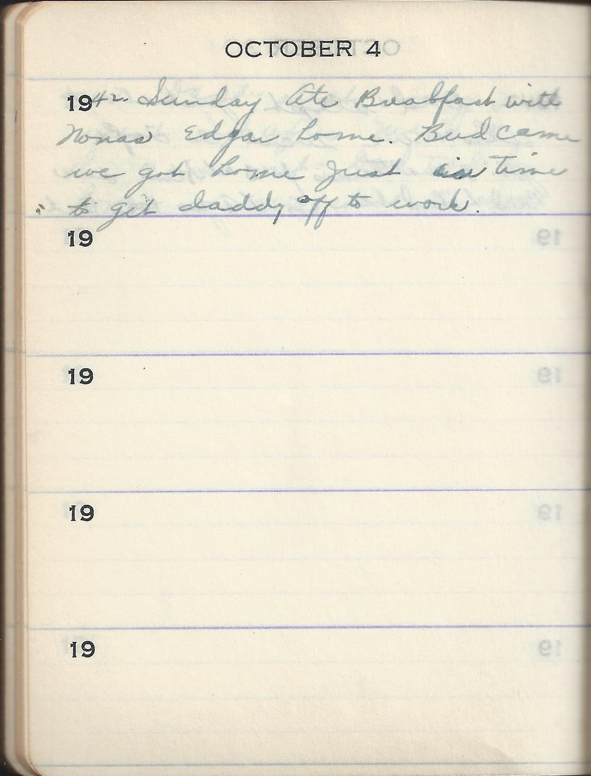 1942 Sunday Ate Breakfast with Nonas Edgar home. Bud came we got home just in time to get daddy of to work.