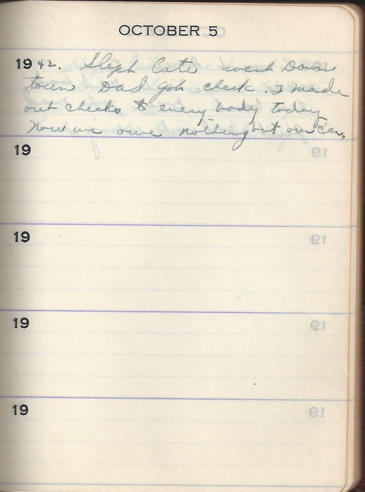 1942 Slept late went Down town Dad got check. I made ou checks to every body today Now we owe nothing but our car.