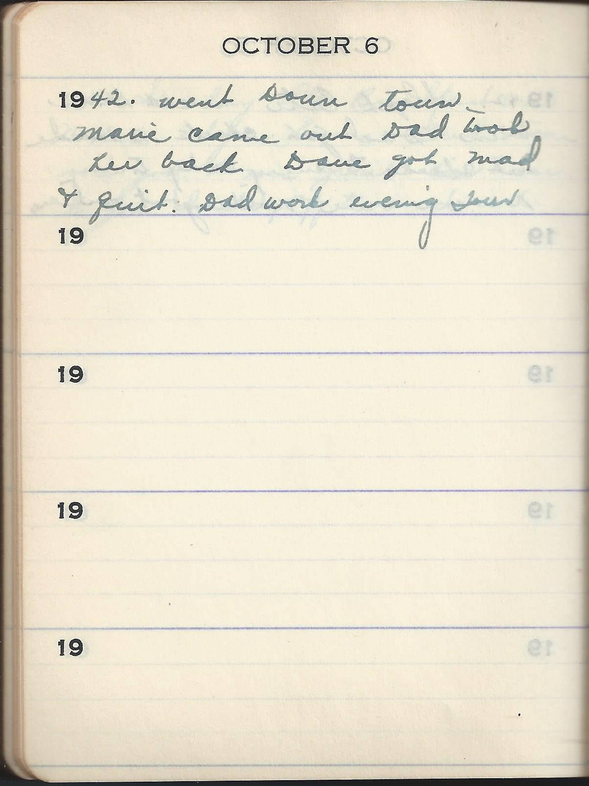 1942 went Down town Marie came out Dad took her back Dave got mad & quit. Dad work evening tour