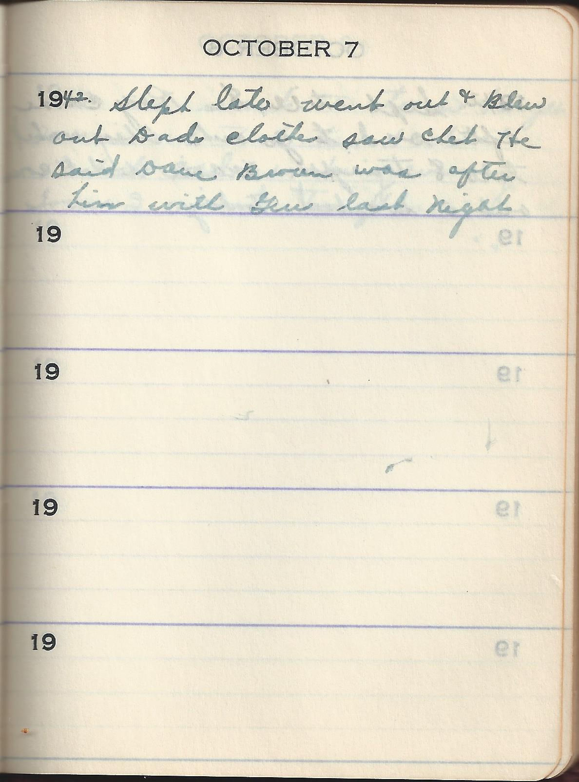 1942 Slept late went out & Blew out Dads clothes saw chet He said Dave Brown was after him with Gus (?) last Night