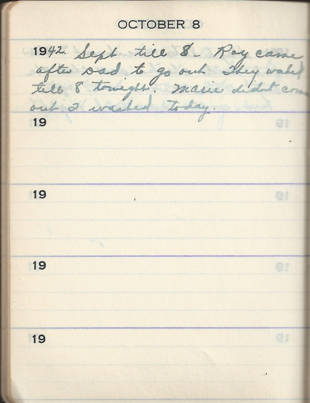 1942 Sept till 8. Roy came after Dad to go out They worked till 8 tonight. Marie didn’t come out I washed today