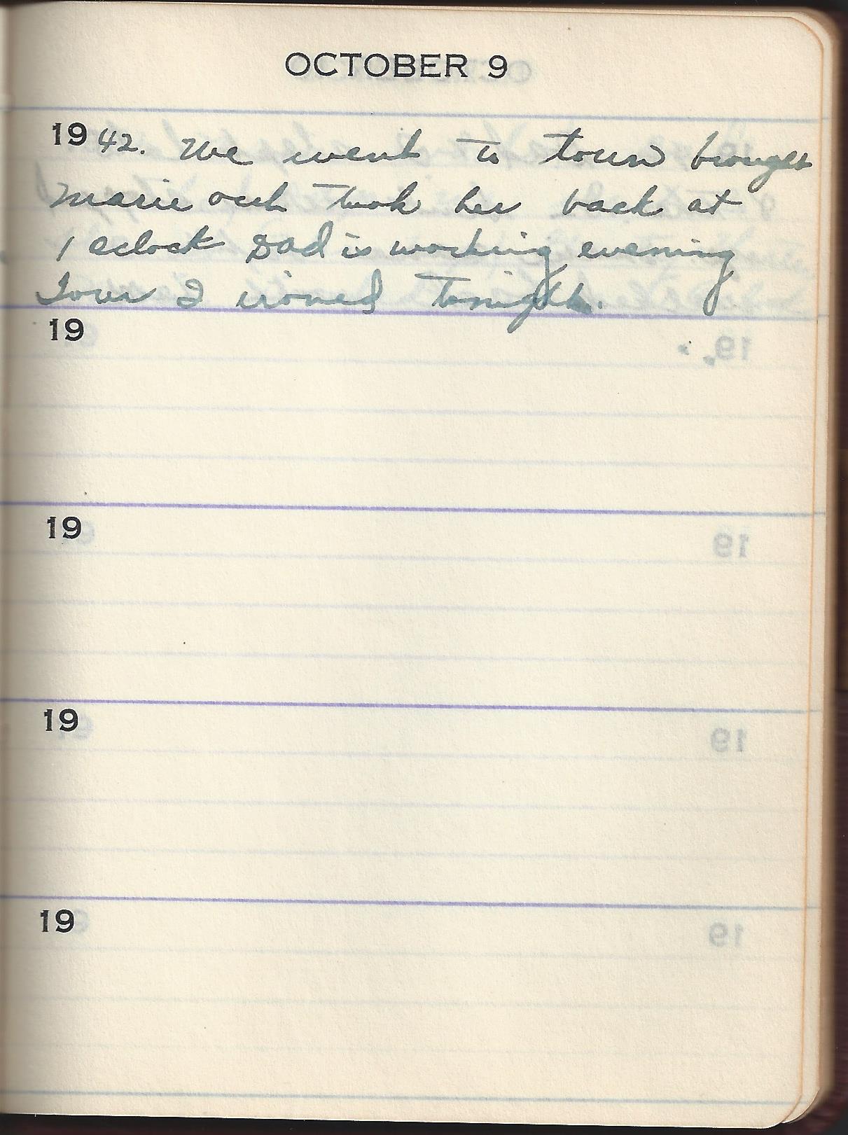 1942 We went to town brought Marie out took her back at 1 oclock Dad is working evening Tour I ironed tonight