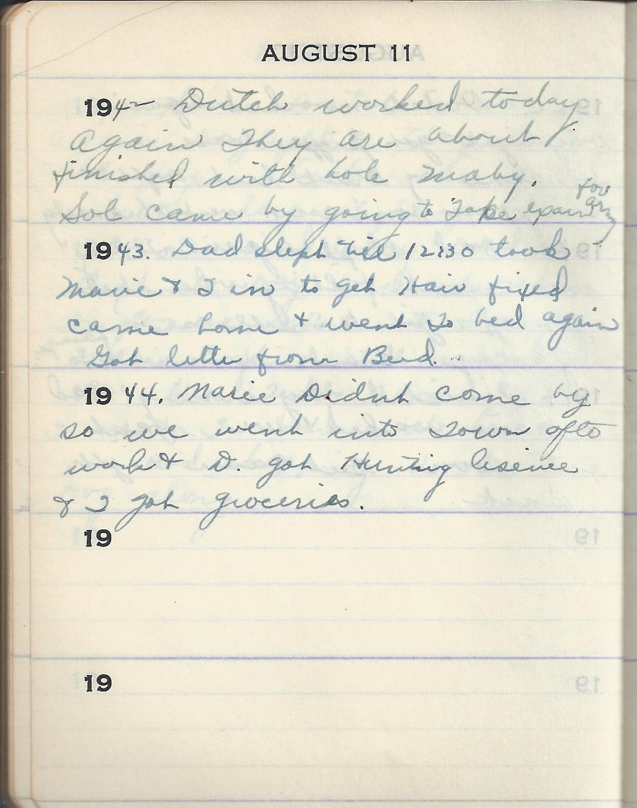 1944 Slept Late Marie came at 2 Daddy had To got out afternoon Tour Today is our Anniversity 23 yrs ago Today-